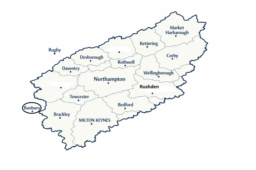 This map highlights the Northamptonshire region we serve. The highlighted areas show the towns within our service radius, including Banbury and the surrounding local areas.