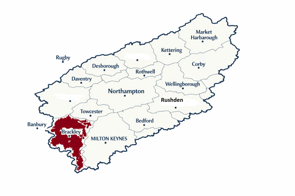 This map highlights the Northamptonshire region we serve. The highlighted areas show the towns within our service radius, including Brackley and the surrounding local areas.