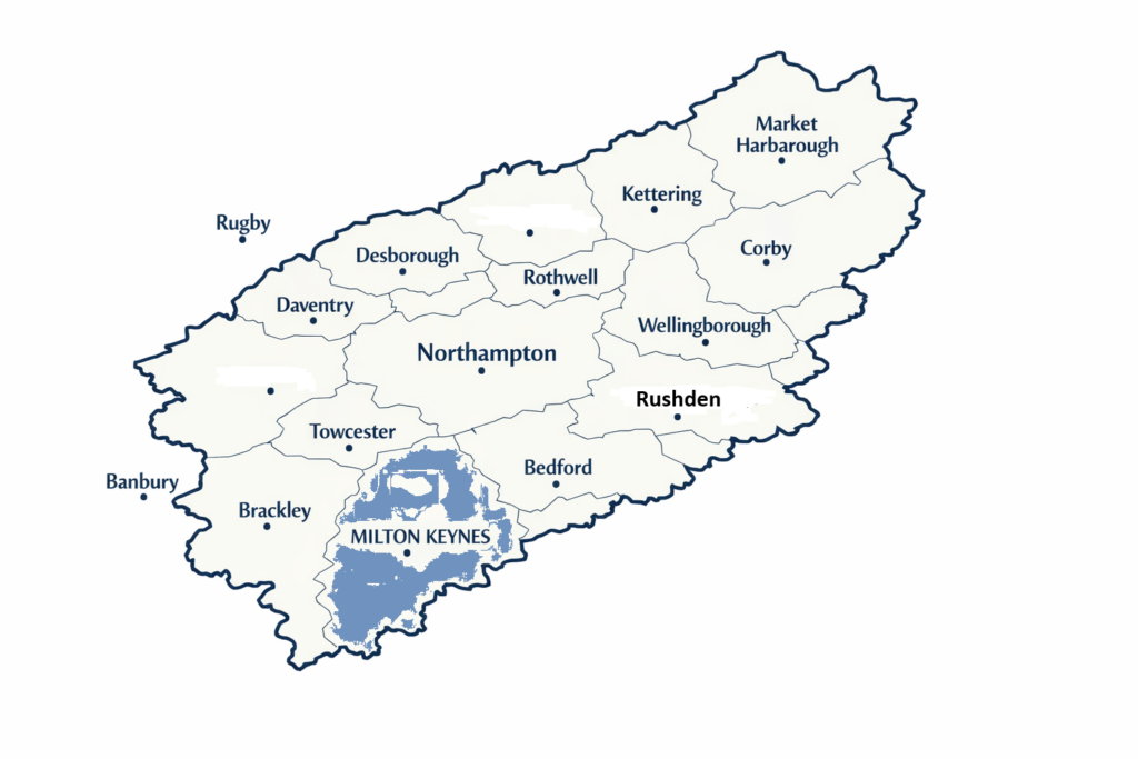 This map highlights the Northamptonshire region we serve. The highlighted areas show the towns within our service radius, including Milton Keynes and the surrounding local areas.