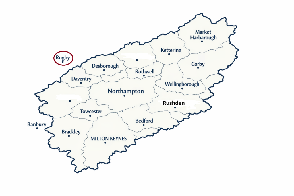 This map highlights the Northamptonshire region we serve. The highlighted areas show the towns within our service radius, including Rugby and the surrounding local areas.
